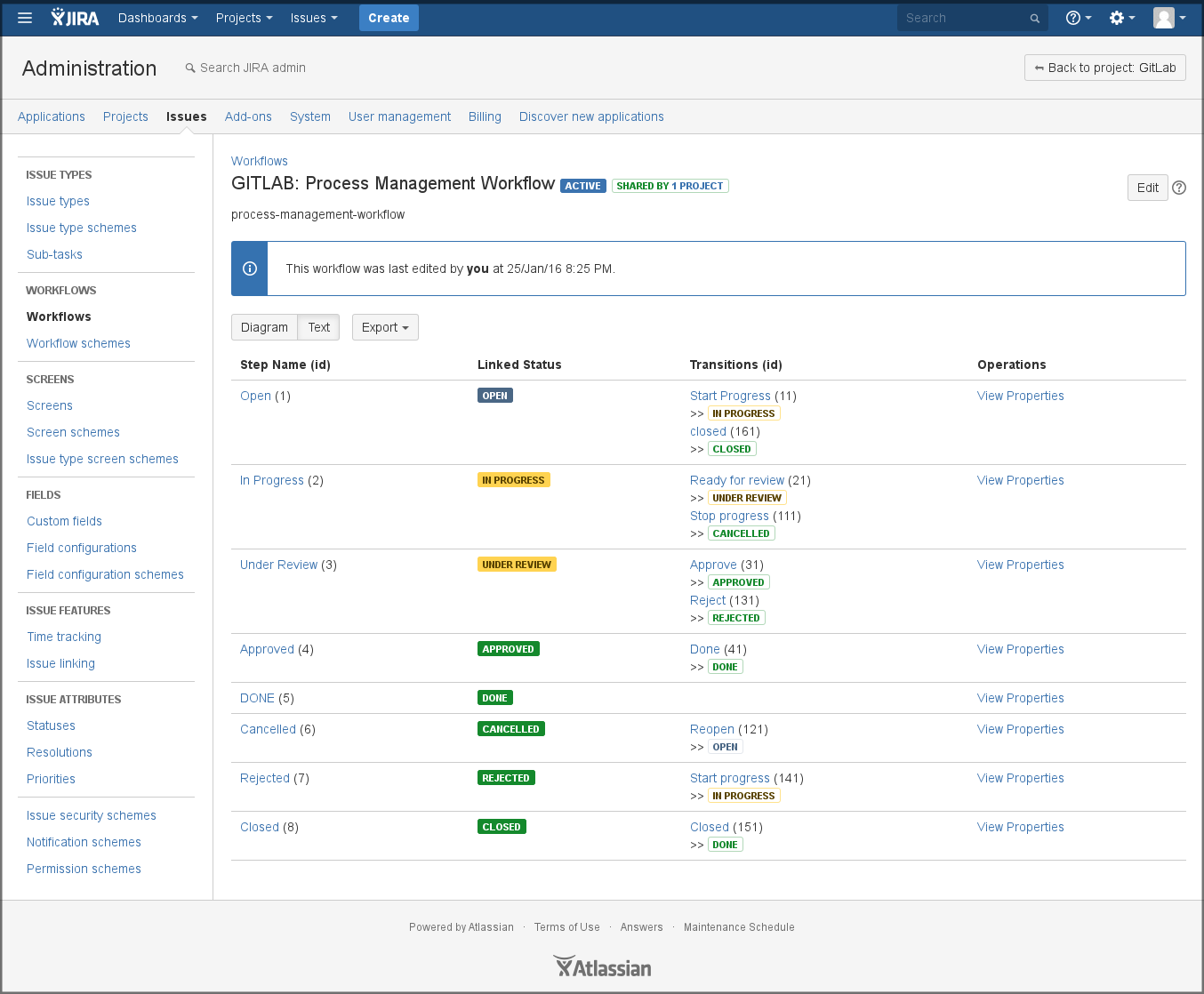 This setting is very important to set up correctly. It is the ID of a transition that moves issues to a closed state. You can find this number under the JIRA workflow administration (Administration > Issues > Workflows) by selecting View under Operations of the desired workflow of your project. The ID of each state can be found inside the parenthesis of each transition name under the Transitions (id) column (see screenshot). By default, this ID is set to 2 . |