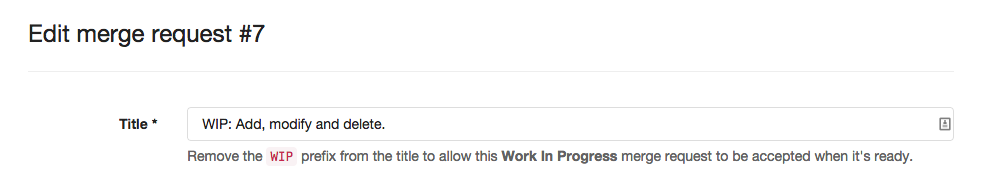 To mark a merge request a Work In Progress, simply start its title with [WIP]