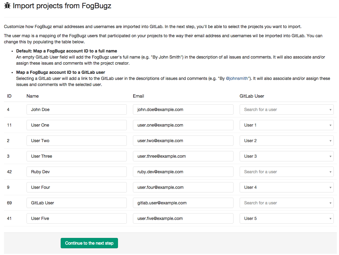 It only takes a few simple steps to import your project from FogBugz. The importer will import all of your cases and comments with original case numbers and timestamps. You will also have the opportunity to map FogBugz users to GitLab users.